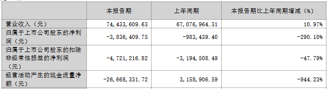 2025年1-3月,公司实现营业收入7,443.36万元,同比增长10.97%;归属于上市公司股东的净利润为-383.64万元,上年同期为-98.34万元;归属于上市公司股东的扣除非经常性损益的净利润为-472.12万元,上年同期为-319.45万元;经营活动产生的现金流量净额为-2,666.83万元,上年同期为315.89万元。
