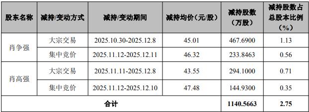 公司12月15日披露关于控股股东减持股份计划期间届满暨实施情况的公告,公司于近日收到控股股东、实际控制人肖争强及肖高强出具的告知函,截至公告披露日,控股股东、实际控制人肖争强及肖高强本次减持计划期间已届满。肖争强自2025年10月30日至12月8日以大宗交易方式减持467.6900万股,减持均价45.01元/股,减持股数占总股本比例1.13%,自2025年11月12日至12月11日以集中竞价方式减持233.8463万股,减持均价46.32元/股,减持股数占总股本比例0.56%;肖高强自2025年11月11日至12月8日以大宗交易方式减持294.1000万股,减持均价43.55元/股,减持股数占总股本比例0.71%,自2025年11月12日至12月10日以集中竞价方式减持144.9300万股,减持均价47.48元/股,减持股数占总股本比例0.35%。二人合计减持金额515718189.16元。