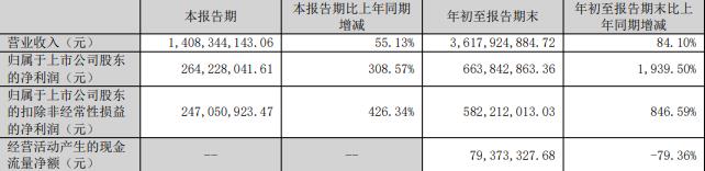 据公司2025年第三季度报告,本报告期,公司实现营业收入14.08亿元,同比增长55.13%;归属于上市公司股东的净利润2.64亿元,同比增长308.57%;扣除非经常性损益后的净利润2.47亿元,同比增长426.34%。