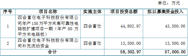 四会富仕本次发行证券的种类为可转换公司A股股票的可转换公司债券。该可转换公司债券及未来转换的A股股票将在深圳证券交易所创业板上市。本次向不特定对象发行可转换公司债券募集资金总额不超过57,000.00万元,扣除发行费用后,募集资金拟用于年产150万平方米高可靠性电路板扩建项目一期(年产80万平方米电路板)和补充流动资金。