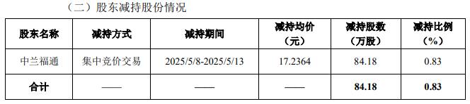 公告显示,5月8日至5月13日,股东中兰福通通过集中竞价交易减持84.18万股,减持均价17.2364元/股。经计算,中兰福通减持金额共计1450.96万元。