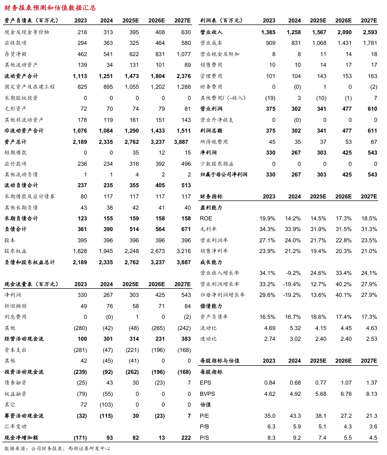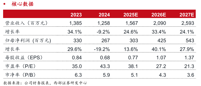 其他业务:公司尚未披露其他业务具体信息且占比较小,保守估计规模保持稳定。预计2025-2027年公司其他业务营业收入分别为0.9亿/1.0亿/1.0亿,同比+3%、+3%、+3%。整体盈利能力保持稳定,预计2025-2027年毛利率分别为40.0%、40.0%、40.0%。