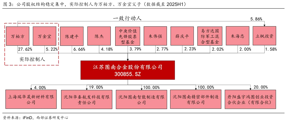 公司股权结构稳定集中,实际控制人为万柏方、万金宜父子。截至2025H1,万柏方直接持有公司27.62%股份,万金宜直接持有公司5.22%股份。公司全资子公司包括图南部件和图南智造。公司全资子公司图南部件“航空用中小零部件自动化加工产线建设项目”已建成投产,形成年产各类航空用中小零部件50万件(套)加工生产能力。图南智造“年产1,000万件航空用中小零部件自动化产线建设项目”目前正在持续开展各项建设投入工作。