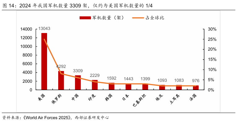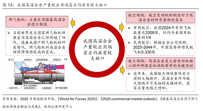 航空发动机的制造对于高温合金材料有着刚性需求,高温合金材料的应用需求主要来自于航空领域,航空领域应用需求的增长及装备建设的加快推进将为我国高温合金材料创造广阔的发展前景。在军用航空领域,据英国《World Air Force 2025》报告,我国2024年军用飞机数量达3309架,总量落后于美国和俄罗斯,居全球第三位,由于当前我国军机保有量仍与美国存在较大差距,随着我国国防和军队现代化建设深入推进,军用航空装备将得到持续稳步发展。