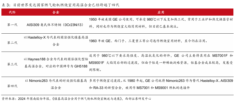 燃气轮机的换代伴随着高温合金的升级。目前世界发达国家燃气轮机燃烧室用高温合金已经跨越了四代。第一代为AISI309奥氏体不锈钢(0Cr23Ni13)于1950年被美国GE公司使用,可承受980℃以下反复加热工况。第二代以Hastelloy-X为代表的固溶强化镍基高温合金,1960年被GE、西门子、三菱重工等公司选作燃烧室用材料,至今仍在沿用。第三代以Haynes188合金为代表的固溶强化型钴基高温合金,适用于980℃以下要求高强度、高温抗氧化的部件。第四代合金是以Nimonic263为代表的时效强化镍基高温合金,多用于燃烧室过渡段。随着我国产燃气轮机的研发替代,燃气轮机对高温合金材料将保持较高的需求。