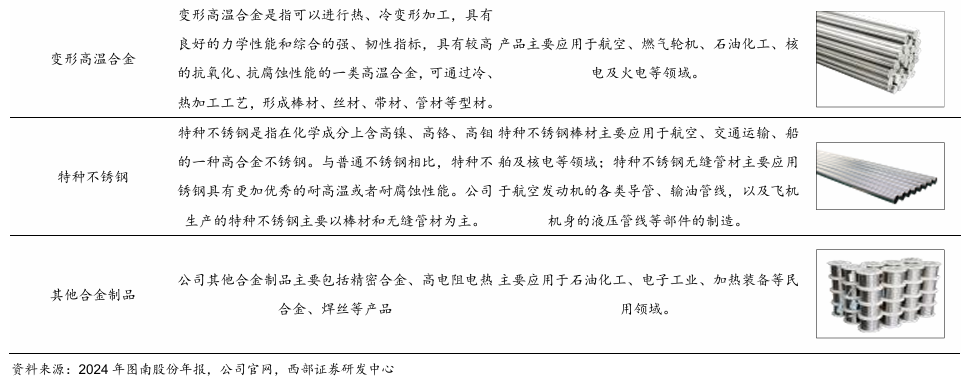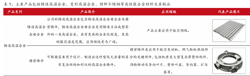 公司是一家专注于高温合金、特种不锈钢等高性能合金材料及其制品的研发、生产和销售,致力于为航空航天、舰船、能源等高端装备制造领域提供产品和服务的高新技术企业,是国内少数能同时批量化生产变形高温合金、铸造高温合金(母合金、精密铸件)产品的企业之一。主要产品包括铸造高温合金、变形高温合金、特种不锈钢等高性能合金材料及其制品,主要应用在包含航空发动机、燃气轮机、核电装备等军用及高端民用领域。