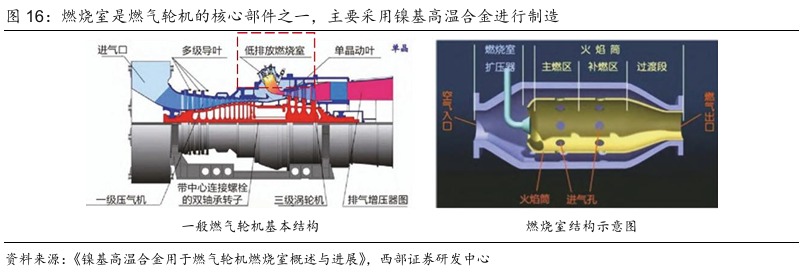 燃烧室是燃气轮机的核心部件之一,工作中承受高温,主要采用镍基高温合金进行制造。燃烧室作为燃气轮机的核心部件之一,要在受限空间及高压环境中承受超过金属熔点的高温燃气;此外,燃气轮机主要用于地面发电机组和船舶动力领域,工作环境需要承受高硫燃气和海水盐分的腐蚀,设备热端部件材料必须使用具有耐高温、较高蠕变强度的高温合金材料,目前国内外主要采用镍基高温合金进行制造。