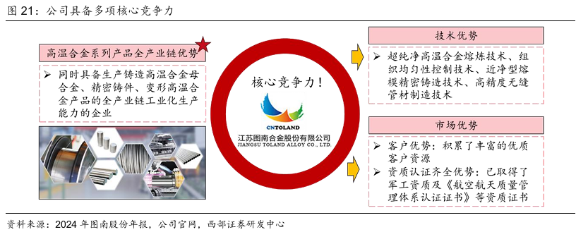 公司具备多项核心竞争力:技术优势、高温合金系列产品全产业链优势、市场优势等。