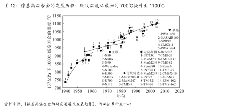 镍基高温合金先后经历了由变形、铸造、定向凝固至单晶的演变,每一次成型技术的革新都使得高温合金的承温能力呈现跳跃式上升。自20世纪40年代初至90年代末期,镍基高温合金的服役温度以每年提高约10℃的速度从最初的700℃提升至1100℃。