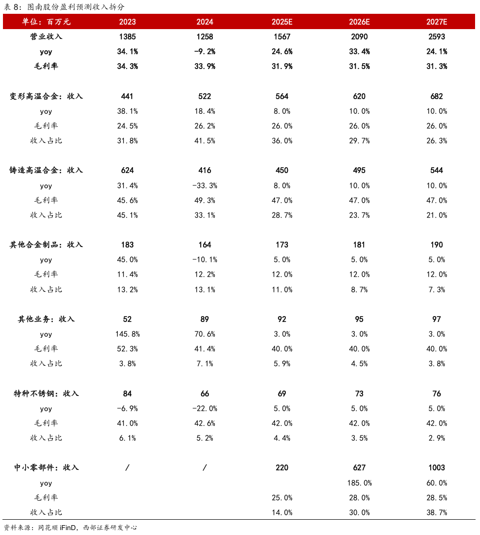 中小零部件:沈阳图南部件以及沈阳图南智造逐步建成投产,公司中小零部件业务业绩有望提速。根据公司披露的相关在手订单情况,预计2025-2027年公司中小零部件营业收入分别为2.2亿/6.3亿/10.0亿,2026、2027年同比+185%、+60%。考虑规模效应,整体盈利能力亦稳中有升,预计2025-2027年毛利率分别为25.0%、28.0%、28.5%。