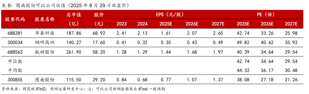 市场普遍认可图南股份在高温合金领域的领先地位及行业高景气度,但对其全流程、多品类协同优势的深度价值,以及新产能布局带来的增量与弹性认识不足。同时,市场对公司短期业绩波动(如2025H1)的关注,可能掩盖了沈阳分部建设即将步入收获期带来的巨大增长潜力,特别是航空用中小零部件自动化加工产能的快速落地的后续贡献。