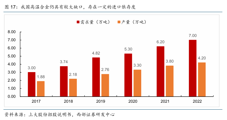 因此,总体看,从需求和产量差异角度来看,我国高温合金仍具有较大缺口,存在一定的进口依存度。根据上大股份招股说明书,我国高温合金需求量迅速增长,从2017年的30,000吨增至2022年的70,000吨,年均复合增长率为18.47%。产量方面,我国高温合金产量从2017年的18,800吨增至2022年的42,000吨,年均复合增长率为17.44%。从需求和产量差异角度来看,我国高温合金仍具有较大缺口,存在一定的进口依存度,公司作为国内少数能同时批量化生产变形高温合金、铸造高温合金(母合金、精密铸件)产品的企业之一,将有望受益。