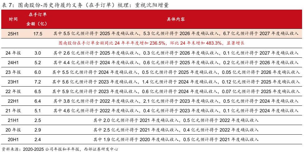 公司在手订单创历史新高,规模突破17.5亿元。截至2025H1,图南股份在手订单规模达17.5亿元,创历史新高,较上年同期增长236.5%,较2024年末增长483.3%。订单结构呈现显著长期化趋势,其中5.5亿元预计于2025年度确认收入,5.3亿元将于2026年确认,6.7亿元计划于2027年交付——未来两年待执行订单占比达69%,为公司未来2年业绩提供强支撑。