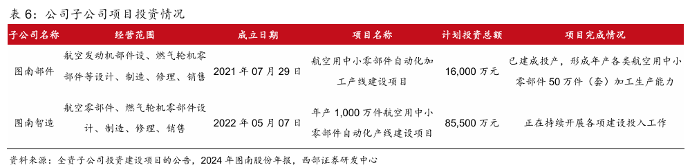 公司积极深度参与航空领域“小核心、大协作”体系建立,子公司积极扩张产线建设。2021年,公司通过全资子公司图南部件开展航空用中小零部件自动化加工产线项目建设,计划形成年产各类航空用中小零部件50万件(套)加工生产能力,目前已建成投产;2022年,公司在沈阳投资设立全资子图南智造,公司将通过图南智造开展年产1,000万件航空用中小零部件自动化产线项目建设,目前正在持续开展各项建设投入工作。