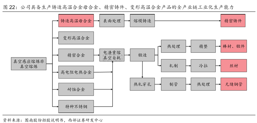 公司具有高温合金系列产品全产业链优势:经过多年发展,公司目前已成为国内高温合金生产企业中少数同时具备生产铸造高温合金母合金、精密铸件、变形高温合金产品的全产业链工业化生产能力的企业。