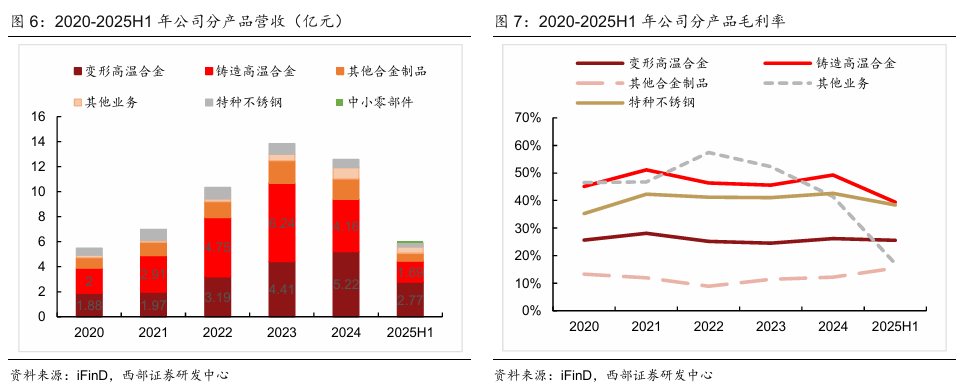 铸造高温合金、变形高温合金为公司主要收入利润来源。分产品看,2024年变形高温合金、铸造高温合金、其他合金制品、其他业务、特种不锈钢分别实现营收5.22/4.16/1.64/0.89/0.66亿元,分别占公司营业收入的41.49%/33.11%/13.07%/7.09%/5.24%。毛利率方面,2024年变形高温合金、铸造高温合金、其他合金制品、其他业务、特种不锈钢毛利率分别为26.16%/49.29%/12.16%/41.42%/42.61%。其中,变形高温合金、铸造高温合金产品为公司贡献了大部分毛利,2024年分别实现毛利1.37/2.05亿元,毛利占比31.99%/48.09%。