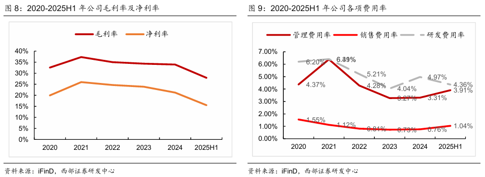 从盈利指标来看,公司近年盈利能力略有波动。2021-2024年公司毛利率保持在34%左右,2024年毛利率为33.93%,同比下降0.4个百分点。2021-2024年公司净利率保持在20%以上,2024年净利率为21.23%,同比下降2.63个百分点。2025H1毛利率下降至27.92%,净利率下降至15.53%。