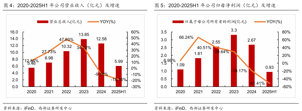 先进金属材料行业是国家重点支持的产业之一,公司近年稳步成长。2020-2023年公司营业收入和归母净利润均稳步增长,24年有所下降。2020-2024年公司营业收入从5.46亿元增长至12.58亿元,复合增长率达23.20%;公司归母净利润从1.09亿元增长至2.67亿元,复合增长率达25.10%。2025H1公司年实现营收5.99亿元,同比-18.16%;实现归母净利润0.93亿元,同比-54.41%。子公司图南智造经营业绩亏损对公司合并经营业绩产生一定影响。图南智造2025H1实现营收0.14亿元,营业利润为-0.38亿元,主要原因是折旧成本增加以及图南智造扩充招聘员工,在职员工总数大幅增加,人工成本相应增加。