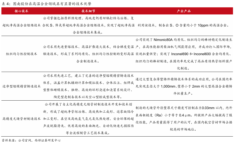公司在高温合金领域具有显著的技术优势。公司利用超纯净高温合金熔炼技术制备出S、O含量均小于10ppm的高温合金;利用组织均匀性控制技术使得Nimonic80A成功打入国际市场,实现批量供货;利用近净型熔模精密铸造技术在国内率先实现直径大于1,000mm、壁厚小于2mm的大型高温合金精铸件批量生产、高精度无缝管材制造技术。利用高精度无缝管材制造技术使公司在国内航空管材市场占据较高的市场地位。