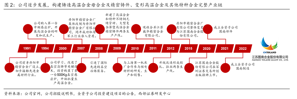 公司是国内少数能同时批量化生产变形高温合金、铸造高温合金(母合金、精密铸件)产品的企业之一。公司前身丹阳市精密合金厂成立于1991年。公司成立之初,采用与原上海第五钢铁厂联营合作的经营方式,进行自主生产高电阻电热合金,初步接触了先进金属材料行业。1994年,公司购入第一台中频感应炉,开展高温合金的研发和试生产。2000年,公司学习、改进了真空浇铸等关键技术,并投资购置了第一台500Kg真空感应炉,开始批量生产高温合金。2007年,公司成功取得军工行业准入资质。2009年,新建了高温合金和特种不锈钢无缝管材、大型复杂薄壁高温合金精密铸件两条生产产线;2012年,升级改造形成锻轧、拉丝两条生产线。至此,公司已具备了生产铸造高温合金母合金及精密铸件、变形高温合金及其他特种合金棒材、丝材、管材、锻件等产品的全产业链工业化生产能力,产品结构基本定型。