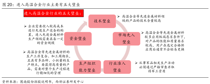 进入高温合金行业壁垒高。高温合金等先进金属材料领域的产品的技术含量较高、对产品的性能和质量要求较高、从事军品相关生产活动必须通过严格审查并取得军工资质等,这些特点导致了进入高温合金行业壁垒高,主要有五大壁垒:技术壁垒、市场先入壁垒、行业准入壁垒、生产组织能力壁垒、资金壁垒。