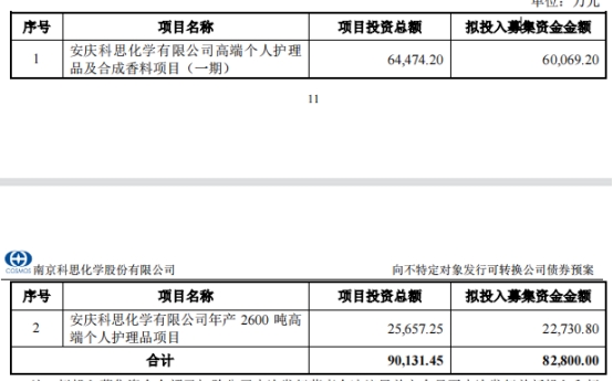 公司本次向不特定对象发行可转换公司债券拟募集资金总额不超过人民币82800.00万元(含82800.00万元),扣除发行费用后,将全部投资于以下项目:安庆科思化学有限公司高端个人护理品及合成香料项目(一期)、安庆科思化学有限公司年产2600吨高端个人护理品项目。