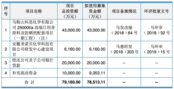 科思股份首次公开发行募集资金总额为8.62亿元,募集资金净额为7.85亿元,其中4.30亿元用于马鞍山科思化学有限公司25000t/a高端日用香原料及防晒剂配套项目(一期工程),6160.00万元用于安徽圣诺贝化学科技有限公司研发中心建设项目,2.00亿元用于偿还公司及子公司银行贷款,9353.11万元用于补充流动资金。