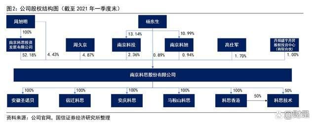 周久京、周旭明是公司实际控制人且为父子关系,公司第一大股东周旭明通过南京科思投资发展有限公司间接持股 52.18%,直接持股4.43%,合计持股56.61%;其父周久京直接持股 4.87%,父子合计持股 61.48%。其他股东持股比例均未超过4%。此外,公司另一大股东杨东生为实控人周旭明之姐夫,通过直接持股0.89%,及南京科投和南京科旭间接持股 0.41%,合计持股1.30%。