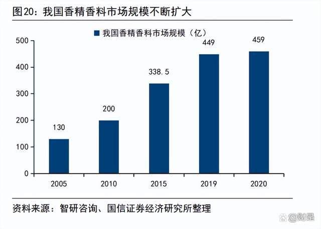 我国香精香料市场快速增长,2005-2020 年 CAGR 高达8.77%。根据资料显示,2020年我国香精香料市场规模为 459 亿元,15 年 CAGR 为8.77%,随之产量也不断上升,相比 2014 年的 90.2 万吨 2020 产量已到 135.6 万吨,6 年CAGR 为7.03%,企业数量已经由 1980 年的 83 家,增加至 1000 余家。根据《香料香精行业“十四五”发展规划》的预计,到 2025 年,我国香料香精行业主营业务收入有望达到500亿元,年均增长 2%以上。