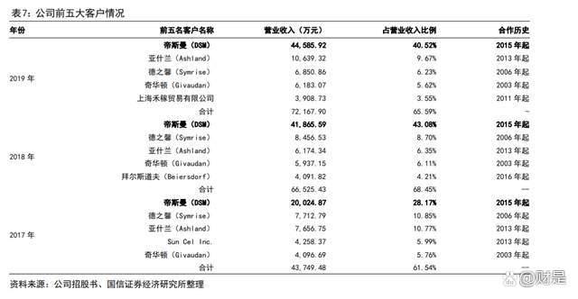 公司下游客户稳定且优质,为公司未来的发展奠定了坚实的基础。公司作为化妆品活性成分和合成香料行业的领先制造企业之一,产品主要面向大型跨国企业为代表的国际主流市场。防晒剂等化妆品活性成分主要客户包括帝斯曼、拜尔斯道夫、宝洁、欧莱雅、强生等跨国化妆品公司和专用化学品公司;合成香料主要客户包括奇华顿、芬美意、IFF、德之馨、高露洁等全球知名香料香精公司和口腔护理品公司。由于大型跨国日用化学和香料香精企业对其原料供应商认证体系要求严格,供应商比较稳定不易更换,此外公司还与部分主要客户签署了长期销售合同,更加稳固合作关系。2021 年公司前五大客户销售额占营业收入57.08%,近五年均保持在 50%以上的水平。