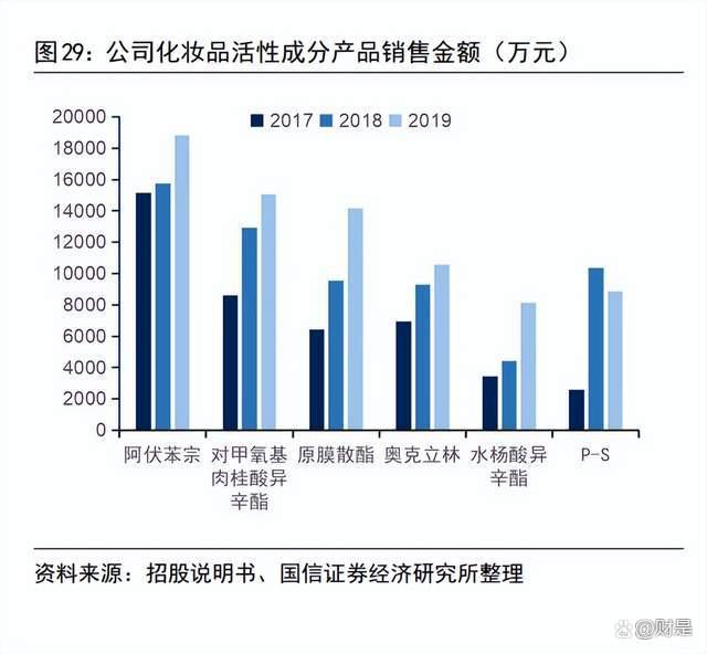 与帝斯曼展开深度合作,合作研发 P-S、P-M 并独家供应。帝斯曼是公司的绝对主要客户,占总营收比例从 2017 年的 28.17%增至 2019 年的40.52%,远超公司其他客户。公司与帝斯曼合作开发了 P-S、P-M 产品,于2016 年末建成生产线投产并向帝斯曼独家供应,仅该两项产品 2018 年销售额相较于上年便增长了9164万元,而公司原有产品同年对帝斯曼销售收入增长额为1.16 亿元,远超对其他客户的销售额增长,帝斯曼的奥克立林、阿伏苯宗、原膜散酯等产品也是100%向公司采购。可见,公司自 2015 年起与帝斯曼公司加深合作是营收增长的重要原因。另外,公司也具备直供欧莱雅、强生、宝洁等终端国际美妆集团的能力,2019年欧莱雅、强生对公司新增订单金额超 2000 万元,占公司总营收比重为2%以上。