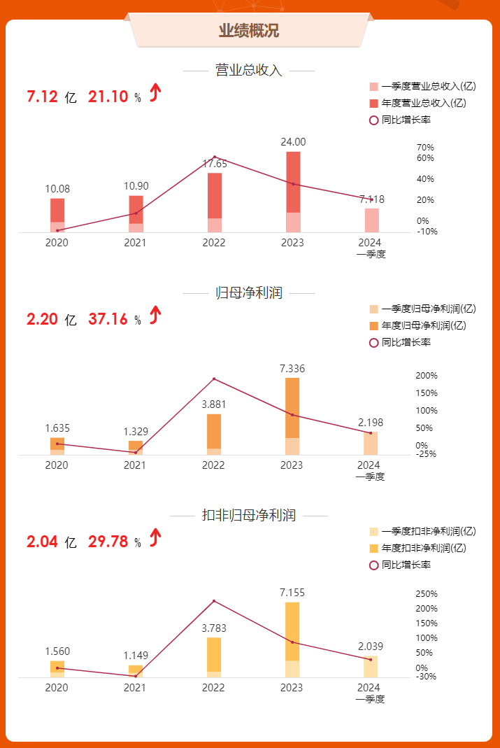 2023年科思股份营收24亿元,同比增长35.99%;归母净利润7.34亿元,同比增长89.02%。2024年一季度营收7.12亿元,同比增长21.10%;归母净利润2.20亿元,同比增长37.16%。