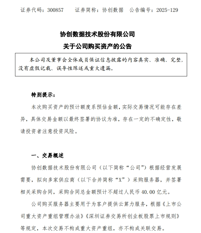 10月21日晚,协创数据发布公告称,公司根据经营发展需要,拟向多家供应商(合并简称“X”)采购服务器,并签署相关采购合同,采购合同总金额预计不超过40亿元。公司购买服务器主要用于为客户提供云算力服务。公司当天召开第四届董事会第六次会议,全票审议通过上述购买资产的议案。