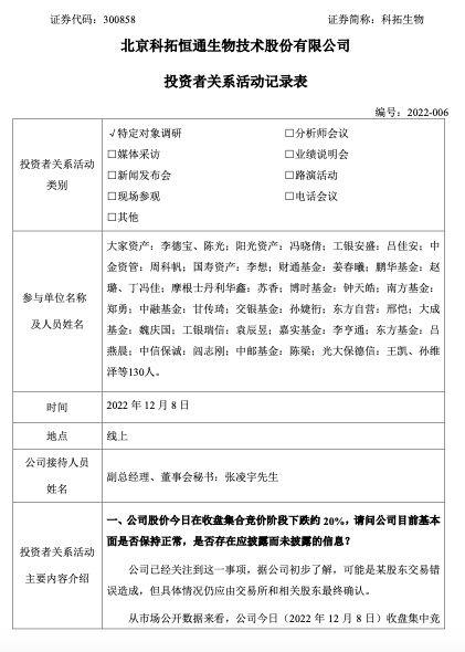 北京科拓恒通生物技术股份有限公司(以下简称“科拓生物”或“公司”)12月8日晚间发布公告称,公司于12月8日接受了多家机构投资者的特定对象调研。在调研中,科拓生物称,公司股价8日在收盘集合竞价阶段下跌约20%的原因,可能是是某股东交易错误造成,但具体情况仍应由交易所和相关股东最终确认。