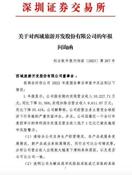 5月19日,西域旅游开发股份有限公司(以下简称“*ST西域”或“公司”)收到深圳证券交易所的年报问询函。问询函要求*ST西域分析公司营业收入出现较大幅度下滑的具体原因;说明公司为解决退市风险拟采取或已采取的具体措施及有效性;详细分析旅游业务毛利率大幅下滑的原因,以及与同行业可比公司是否一致等。