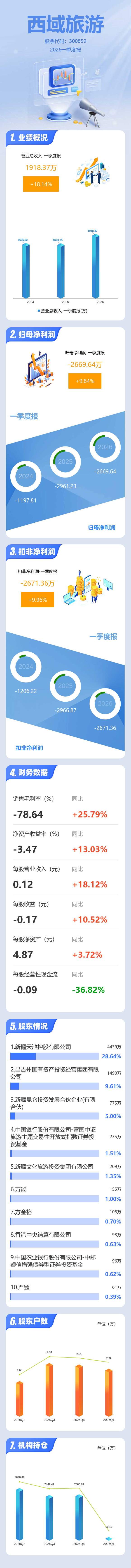 证券之星消息,西域旅游2026年一季报显示,一季度公司主营收入1918.37万元,同比上升18.14%;归母净利润-2669.64万元,同比上升9.85%;扣非净利润-2671.36万元,同比上升9.96%;负债率26.52%,投资收益-51.45万元,财务费用97.14万元,毛利率-78.64%。