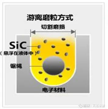 游离磨料砂浆切割工艺,主要用到钢线,莫氏硬度仅低于金钢石的碳化硅,聚乙二醇。如图所示,碳化硅只是游离在钢线液体周围,采用砂浆切割,切割一吨硅棒,大概要消耗300公斤的钢线、300公斤碳化硅、300公斤聚乙二醇,还有相当的人工,电水费等。