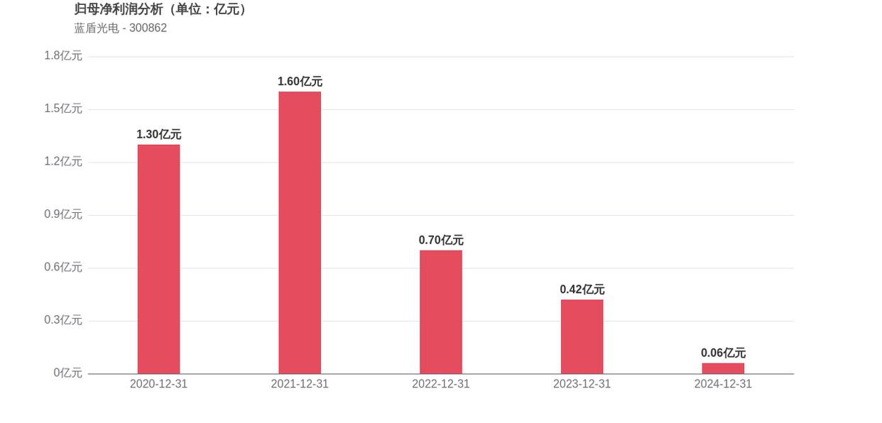 利润角度分析,2020年蓝盾光电实现归母净利润1.30亿元,2024年0.06亿元。归母净利润持续大幅下滑。