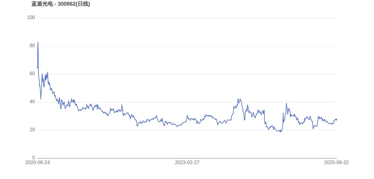 蓝盾光电自2020年8月24日上市至今,已迎来5周年。从上市首日收盘价为64.68元、市值85.29亿元,到如今市值达到51.12亿元。