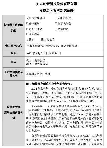 10月19日晚间,安克创新科技股份有限公司(以下简称“安克创新”或“公司”)发布公告,公告称,2022年9月28日-10月14日,公司与37家机构共66位参会人员进行了特定对象调研线上会议。