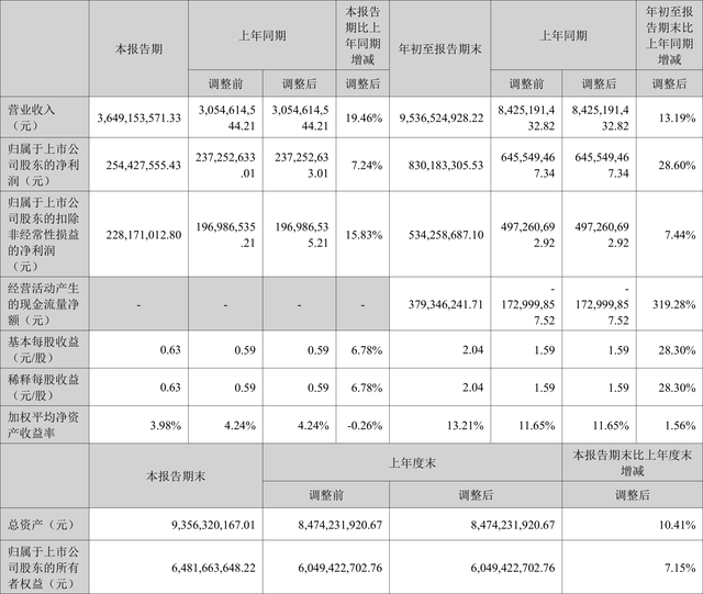 根据三季报,公司第三季度实现营业总收入36.49亿元,同比增长19.46%,环比增长20.73%;归母净利润2.54亿元,同比增长7.24%,环比下降32.50%;扣非净利润2.28亿元,同比增长15.83%,环比增长54.26%。