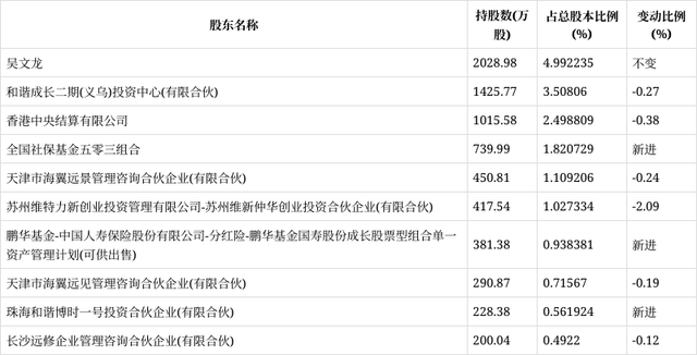 三季报显示,2022年三季度末的公司十大流通股东中,新进股东为全国社保基金五零三组合、鹏华基金-中国人寿保险股份有限公司-分红险-鹏华基金国寿股份成长股票型组合单一资产管理计划(可供出售)、珠海和谐博时一号投资合伙企业(有限合伙),取代了二季度末的欣旺达电子股份有限公司、高韬、深圳思齐资本信息技术私募创业投资基金企业(有限合伙)。在具体持股比例上,和谐成长二期(义乌)投资中心(有限合伙)、香港中央结算有限公司、天津市海翼远景管理咨询合伙企业(有限合伙)、苏州维特力新创业投资管理有限公司-苏州维新仲华创业投资合伙企业(有限合伙)、天津市海翼远见管理咨询合伙企业(有限合伙)、长沙远修企业管理咨询合伙企业(有限合伙)持股有所下降。