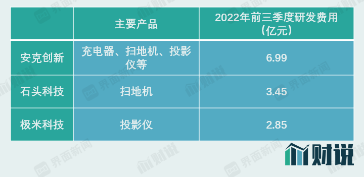 2022年前三季度,安克创新研发费用为6.99亿元,需要分摊到充电器、扫地机、投影仪、耳机、3D打印机等多个产品品类。主营扫地机的石头科技和主营投影仪的极米科技同期研发费用分别3.45亿元和2.85亿元。虽然安克创新研发费用高于石头科技(688169.SH)和极米科技(688696.SH),但其在扫地机和投影仪这两个产品上的研发投入可能不如竞争对手。