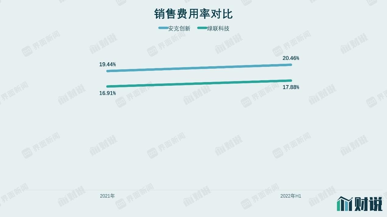 一是安克创新销售费用投入效率不高,多个品牌分摊了营销费用。这导致安克创新销售费用率显著高于同样以充电类产品为主的绿联科技。2021年,安克创新销售费用率为19.44%,比绿联科技高2.53个百分点,;2022年上半年,安克创新销售费用率为20.46%,同样比绿联科技高2.58个百分点。
