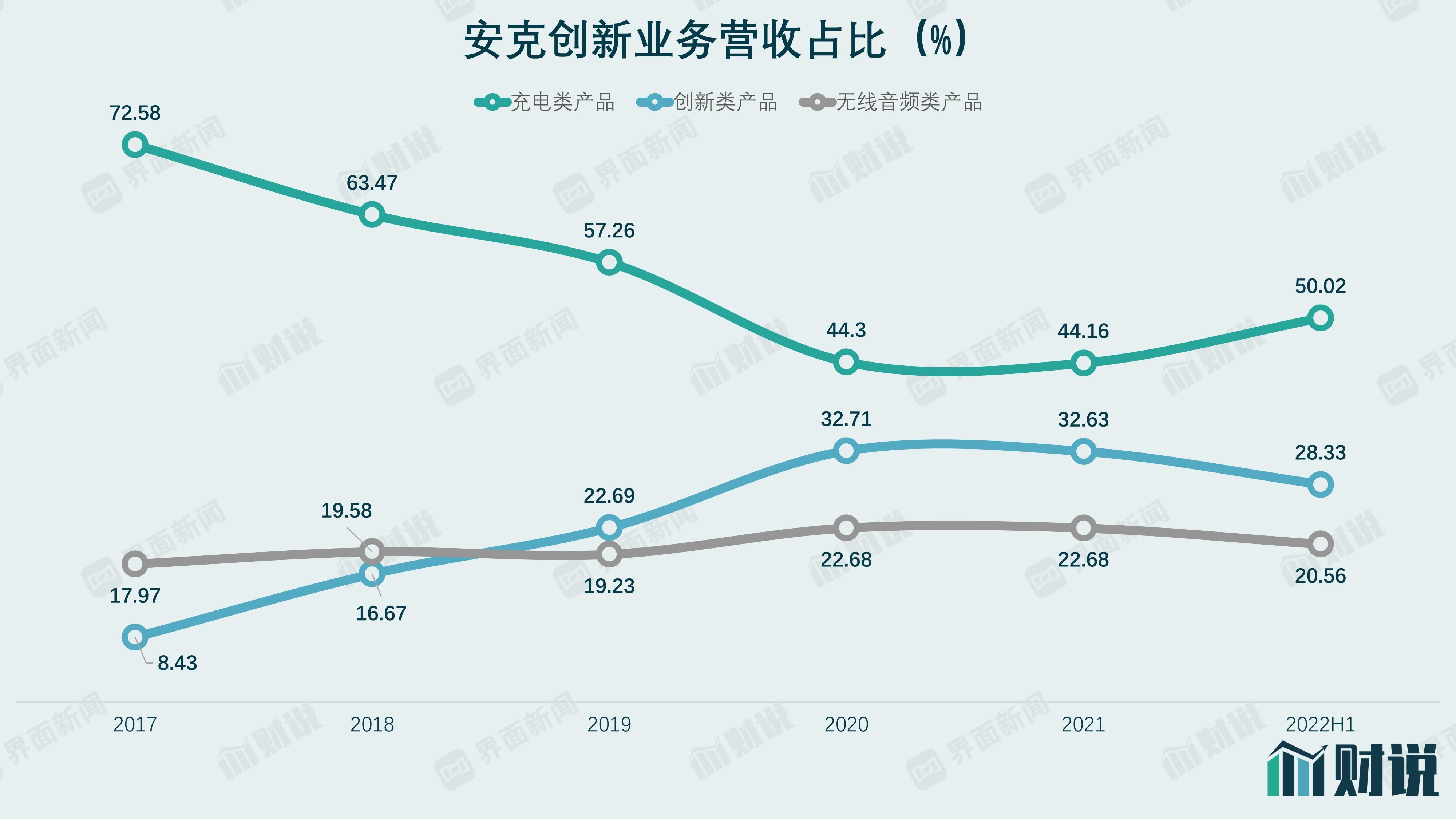 2022年初,安克创新董事长阳萌在接受采访时曾表示,“我们销售额里只有百分之四十多是充电了,而且每年都在降低。”