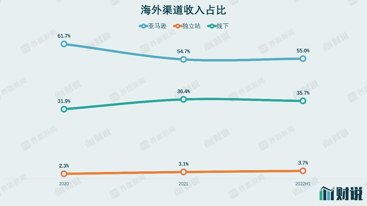 上市之初,安克创新的亚马逊渠道占比较高,因此其总体方针是降低亚马逊渠道比例,提高独立站和线下渠道比例。