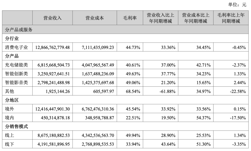 充电储能类产品:收入68.16亿元,较上年同期增长37.00%