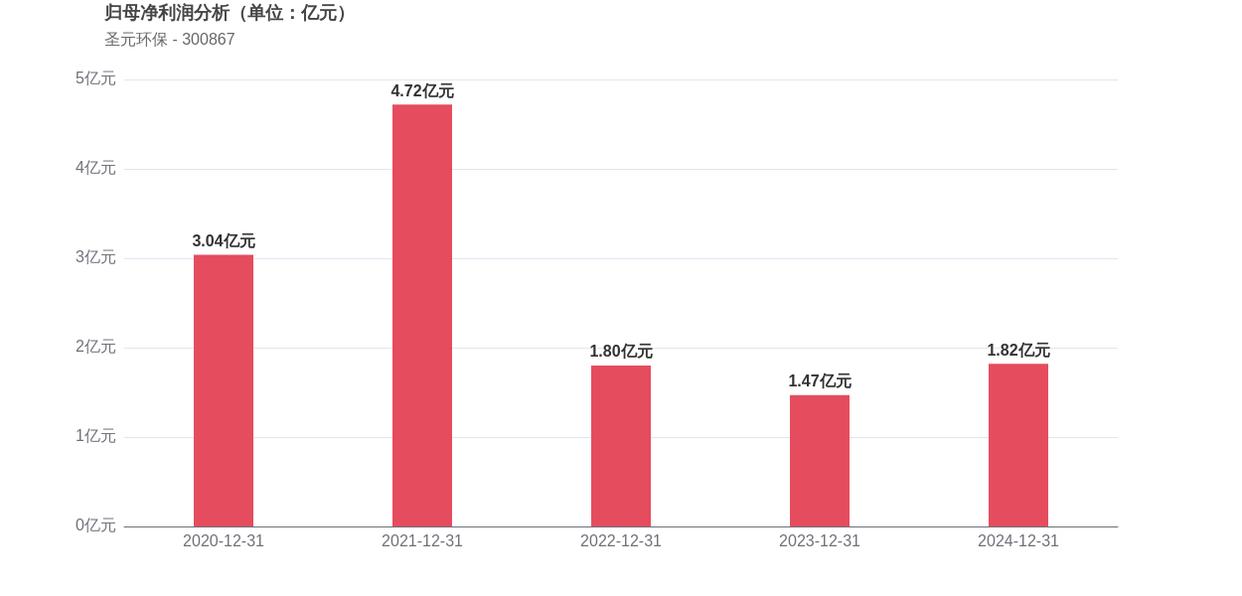 圣元环保上市的2020年,当年实现归母净利润3.04亿元。截至最新完整财年的2024年,公司实现1.82亿元的归母净利润,近年累计下降了40.04%。这5年间,圣元环保无一年份出现亏损。