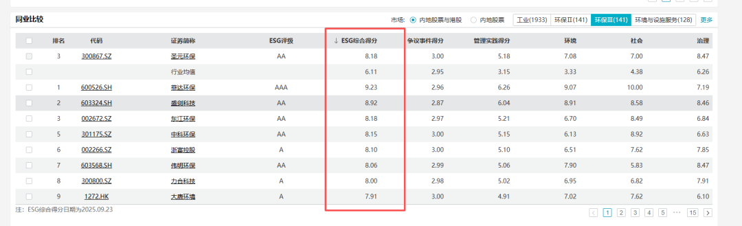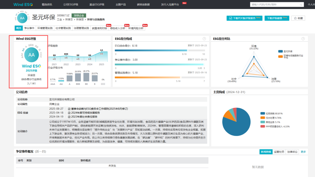 近日,国内权威的金融数据服务提供商万得(Wind)发布公司最新的ESG评分评级结果。圣元环保(300867.SZ)凭借在环境、社会和公司治理(ESG)领域的卓越表现和管理成果获评“AA”级,在Wind ESG综合得分中获评8.18分,在环保行业141家公司中位列第3名。