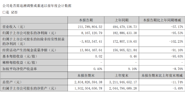 从营收和利润方面看,公司本报告期实现营业总收入2.12亿元,同比下降57.17%,净利润816.71万元,同比下降95.53%,基本每股收益为0.02元。